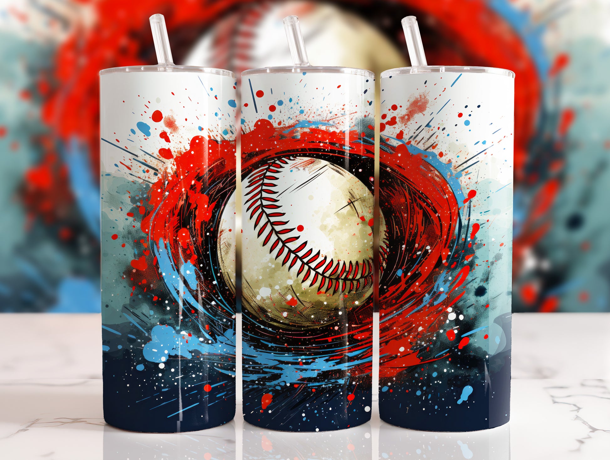 Bold baseball-themed design featuring dynamic splashes and a detailed game-ready baseball. Perfect for sports fans and gift ideas. Drinks stay hot or cold for hours.