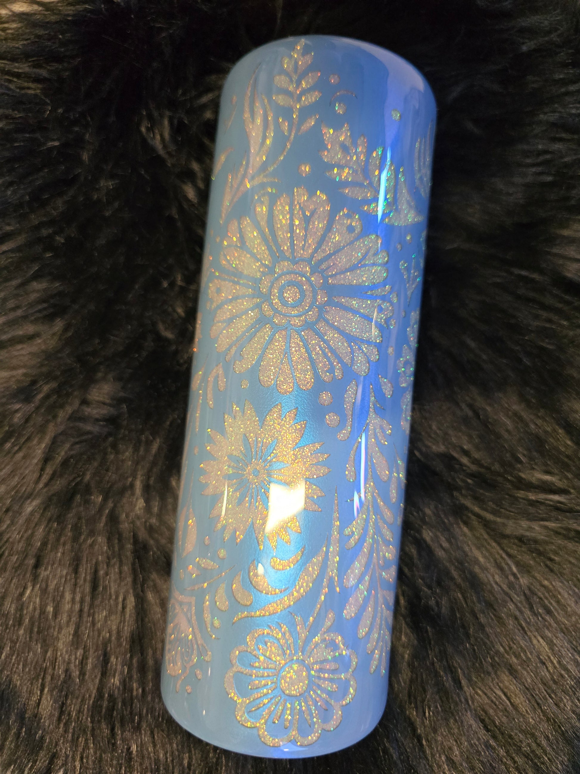 Light blue pearlescent base with a glitter floral pattern. Keeps drinks hot or cold for hours.