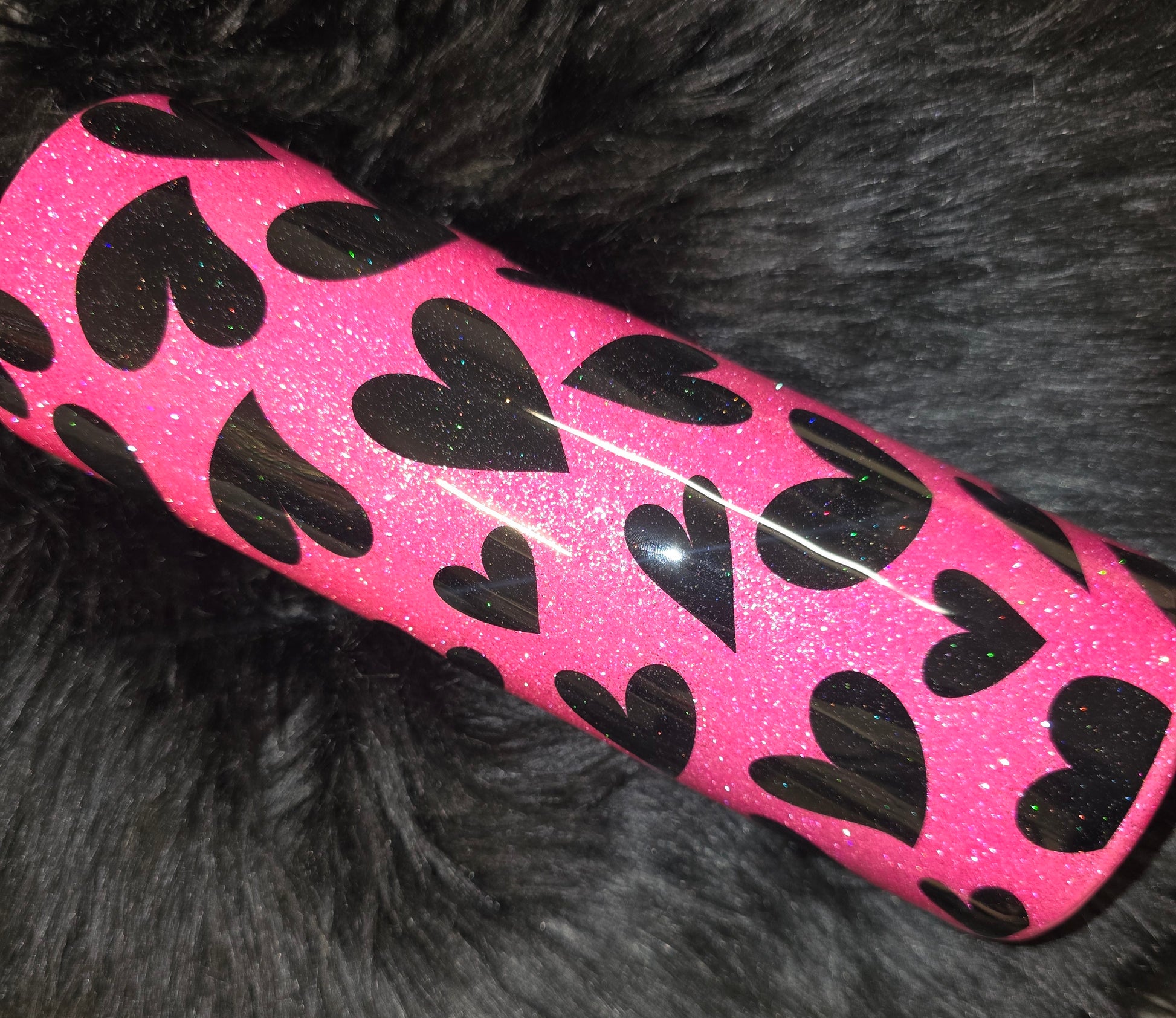 Stunning pink glitter tumbler with black glitter hearts. Keeps drinks hot or cold for hours.